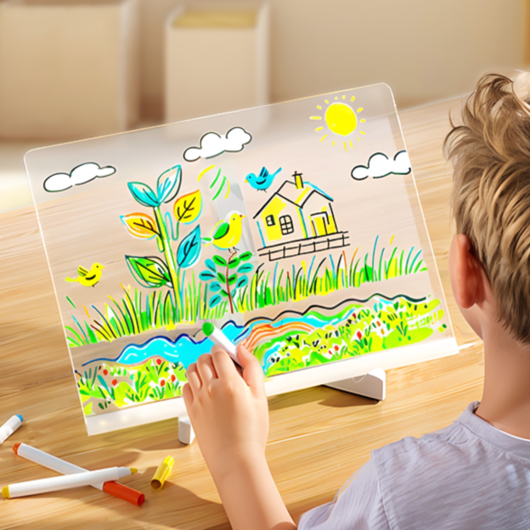 Het bord laat kinderen vrij tekenen en schrijven met kleurrijke lichtjes, waardoor hun verbeelding tot leven komt zonder de behoefte aan schermen.